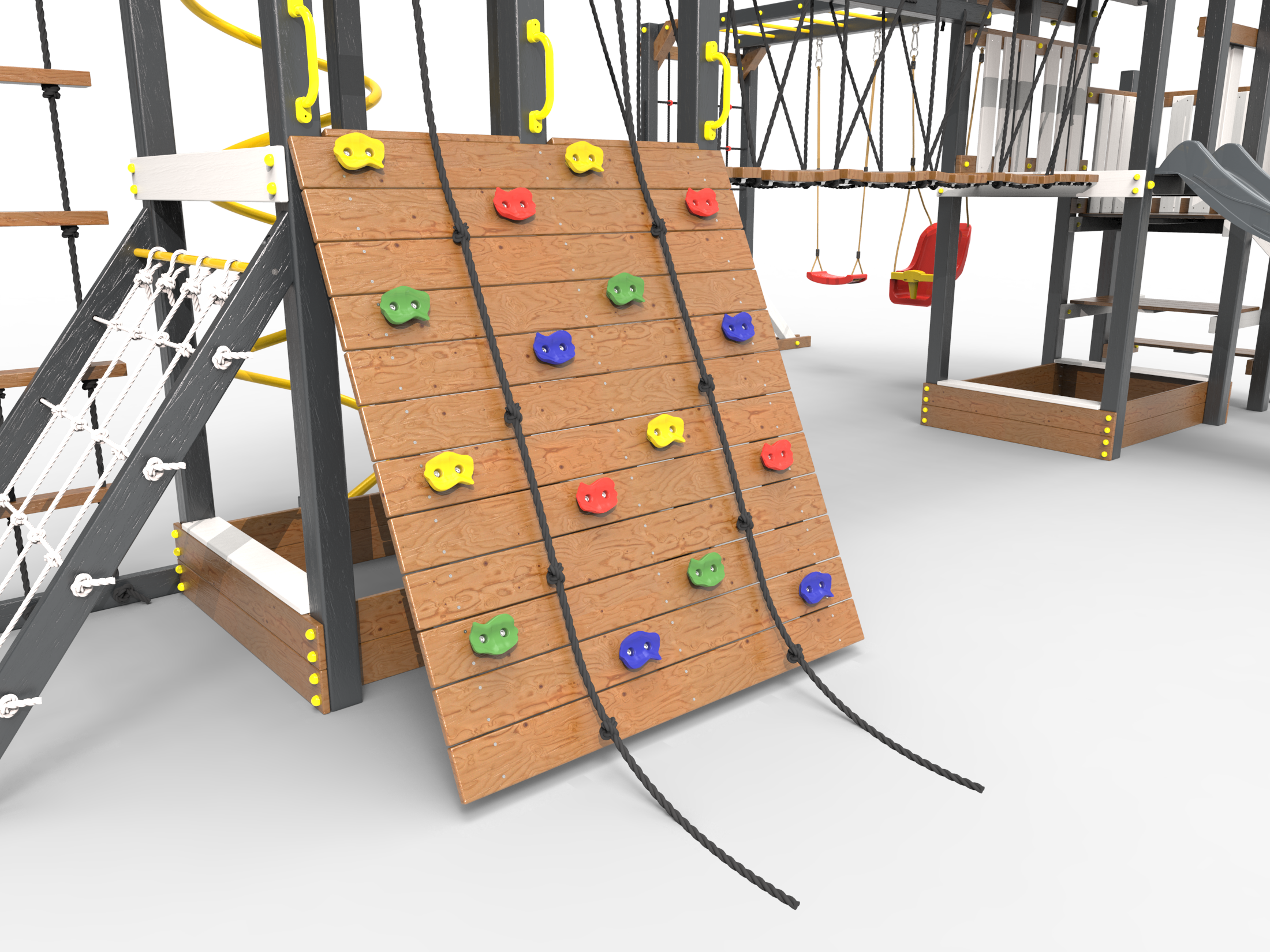 Обращаем Ваше внимание, что фактический цвет детской площадки может отличаться от представленных фото на сайте. Специфика окраски нетоксичными пропитками и красителями допускает отклонения в цветовой гамме отгружаемых изделий. Также обратите внимание, что фактический цвет может отличаться из-за цветопередачи устройства на котором Вы смотрите фото. Производитель оставляет за собой право менять цвет отдельных деталей и комплектующих(включая пластик, канаты и пр.), при этом сохраняя весь функционал и характеристики товара.